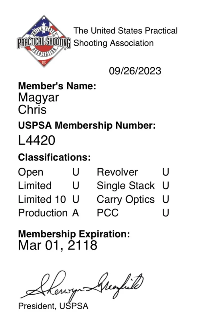 Chris Magyar’s USPSA Classification Card showing his A-Class classification in the Production Division